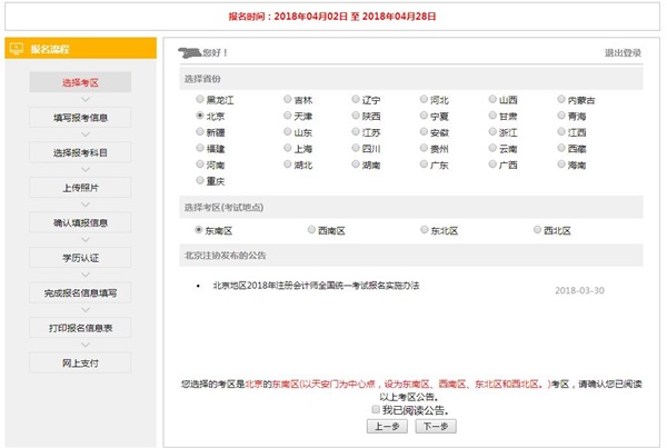 选择考区-->填写报考信息-->选择报考科目-->上传照片-->确认填报信息-->学历认证-->完成报名信息填写-->打印报名信息表-->网上支付