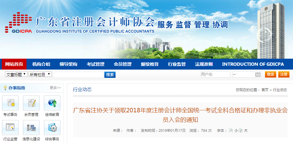 2018年度注册会计师全国统一考试成绩已于2018年12月10日发布,根据《中国注册会计师协会章程》、《广东省注册会计师协会章程》和中注协统一部署,现就领取2018年度注册会计师全国统一考试全科合格证和办理非执业会员入会相关事项通知如下: