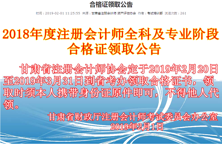 甘肃省注册会计师协会定于2019年2月20日至2019年3月31日到省考办领取合格证书,领取时须本人携带身份证原件即可,不得他人代领。