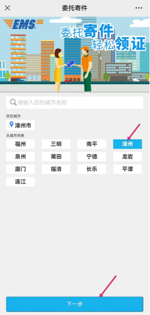 步骤一:关注“福建邮政EMS”微信公众号,选择“寄件”