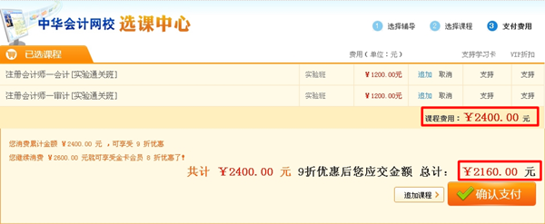 初次来到网校,正小保计划报名注册会计师《会计》和《审计》两个科目的实验直达班辅导课程,两科课程累计金额为2400元,正小保具有了银卡会员资质,享受到了9折优惠,折后价格为2160元!