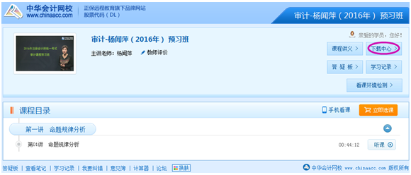 ■进入注册会计师课程观看页面后找到“下载中心”,点击进入。