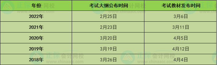 暂时不确定2023年注会教材发布时间,以下是正小保整理的2018年-2022年注会考试大纲及教材公布时间,大家可以作为参考: