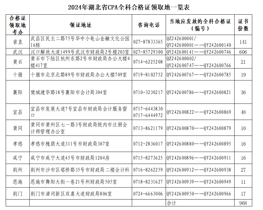 全省全科合格证纸质证书已按照考生报名时所选的“证书领取地”分发到各市州考办。所有全科合格考生均可到所属考办现场领取纸质版,省直及武汉地区可选择现场领取或邮寄领取任一方式。“证书领取地”为其他市州的考生,请咨询当地考办有关领证安排。各考办信息详见下表《2024年度湖北省CPA全科合格证领取地一览表》,考生可参照表中列示的各考办发放的全科合格证号码段查询本人“证书领取地”,本人携带身份证原件至现场领取。