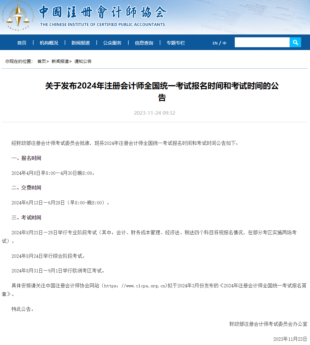 经财政部注册会计师考试委员会批准,现将2024年注册会计师全国统一考试报名时间和考试时间公告如下:
