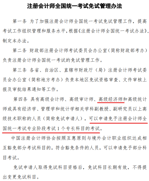 根据《注册会计师全国统一考试免试管理办法》可知,具有高级会计师、高级审计师、高级经济师和高级统计师或具有经济学、管理学和统计学相关学科副教授、副研究员以上高级技术职称的人员(简称免试申请人),可以申请免予注册会计师全国统一考试专业阶段考试1个专长科目的考试。