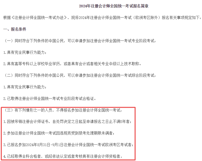 但根据中注协发布的2024年注会报名简章来看,有4类考生不得报名2024年注册会计师考试!截图如下: