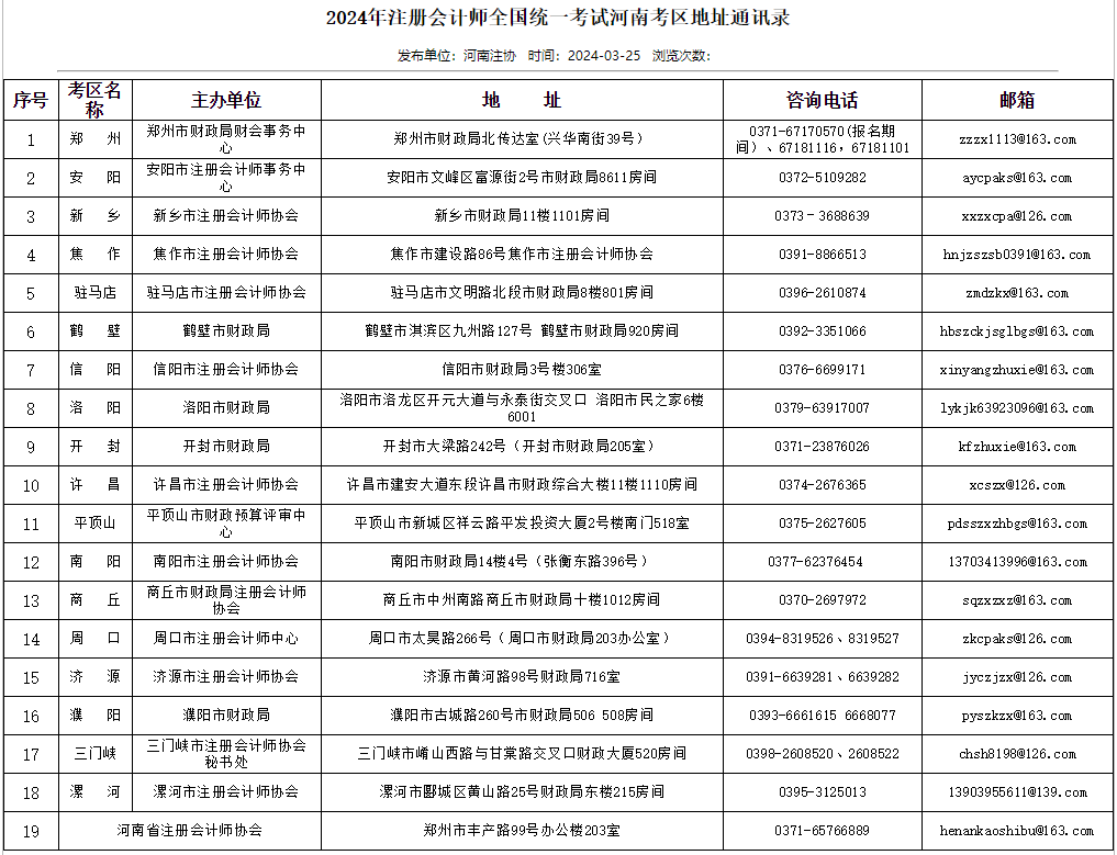 报名中若遇到问题可咨询当地注协,以下是2024年注册会计师全国统一考试河南考区地址通讯录: