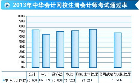 虽然全国注册会计师各科考试成绩合格率比较低,但考注册会计师的考生也不要害怕,正保会计网校学员注册会计师各科考试成绩合格率还是不错的,具体数据如下: