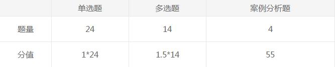 单选题24小题,每小题1分,共24分;多选题14小题,每小题1.5分,共21分;案例分析题4小题共55分,其中一道小题可以用中文或英文解答,如使用英文解答,须全部使用英文,答题正确的,增加5分,案例分析题最高得分为60分。