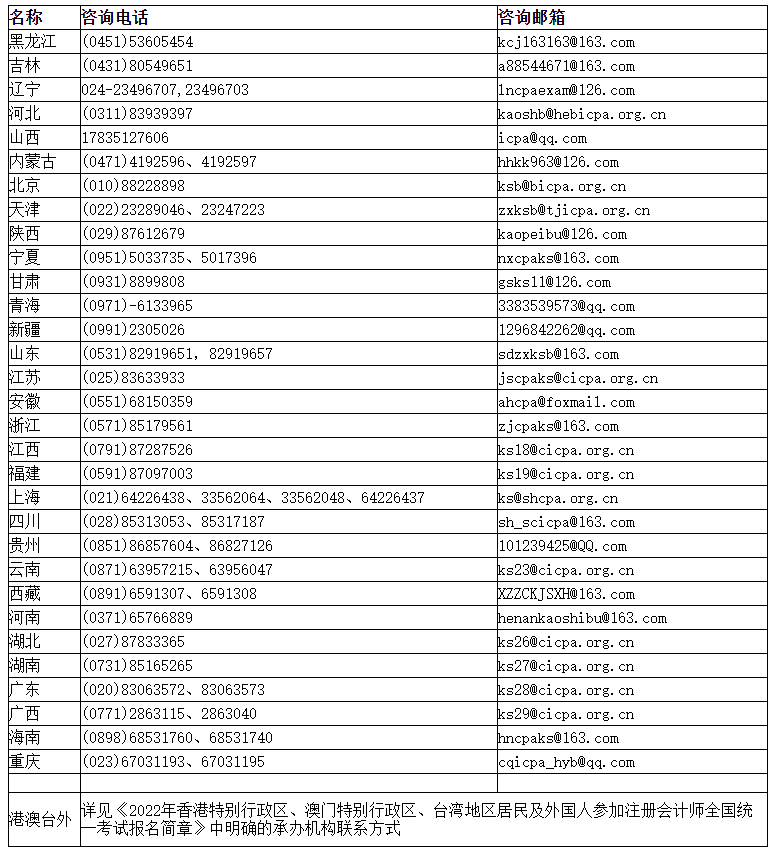 2022年报名期间各省咨询电话及邮箱清单