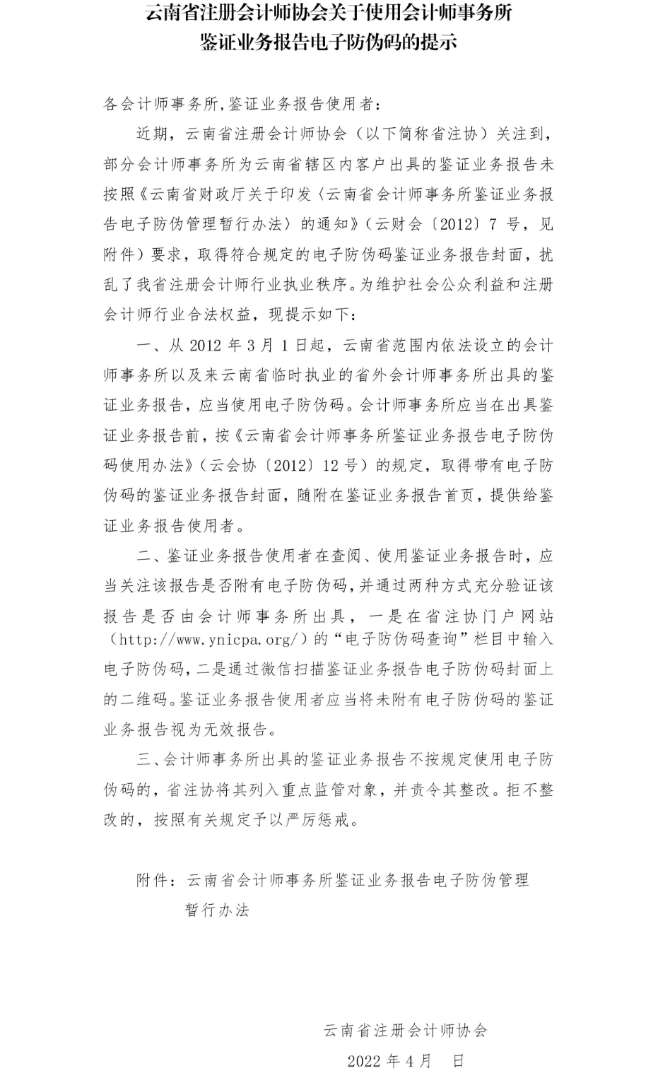 云南省注册会计师协会关于使用会计师事务所鉴证业务报告电子防伪码的提示