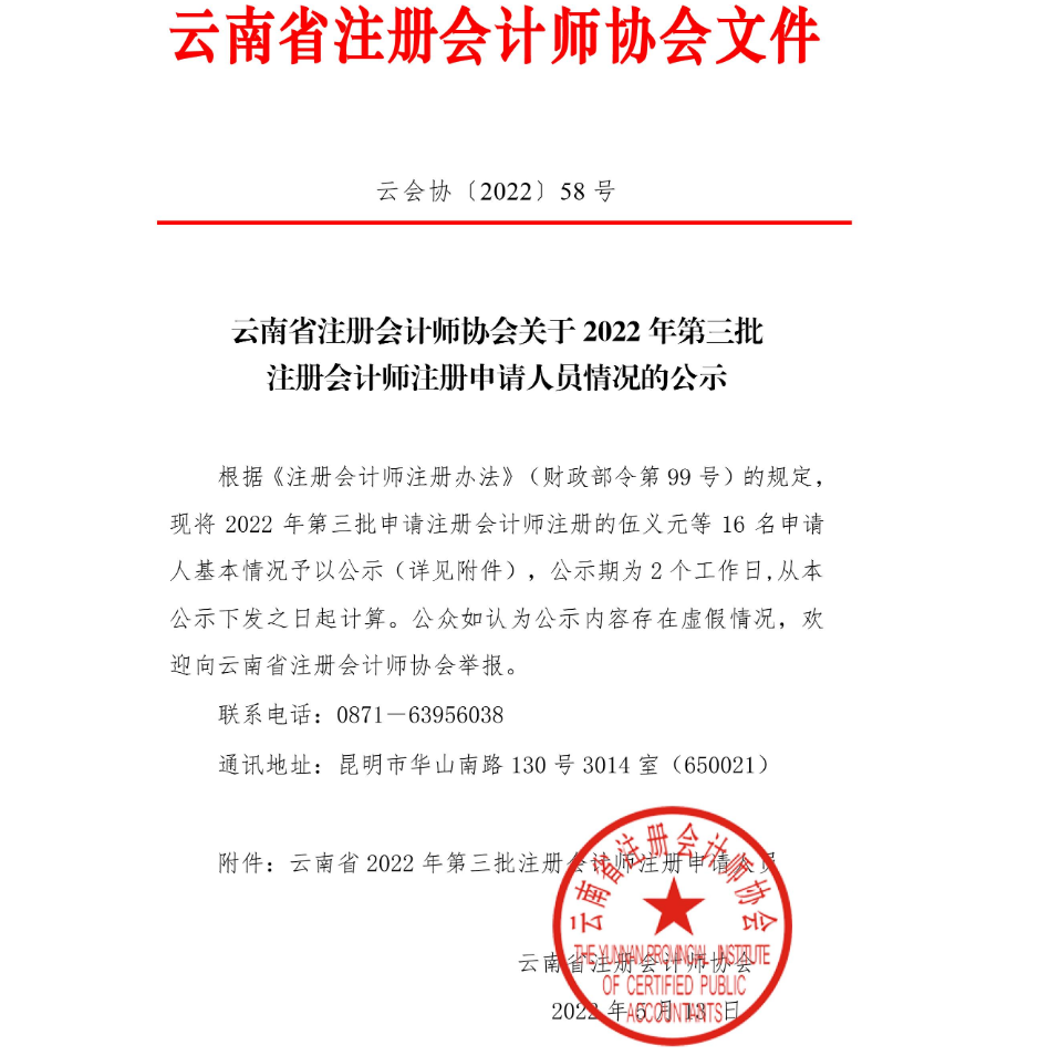正文:云南省注册会计师协会关于2022年第三批注册会计师注册申请人员情况的公示.pdf