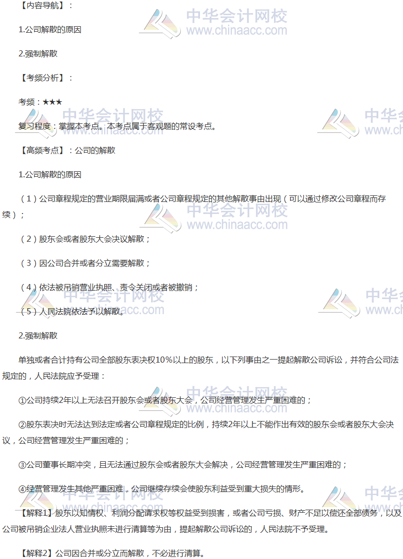 备考时间紧张,抓紧时间抓住重点备考注册会计师吧!正保会计网校教学老师为广大考生整理了高频考点,我们一起来学习2018《经济法》高频考点:公司的解散。本考点属于《经济法》第六章公司法律制度第六节公司解散和清算的内容。
