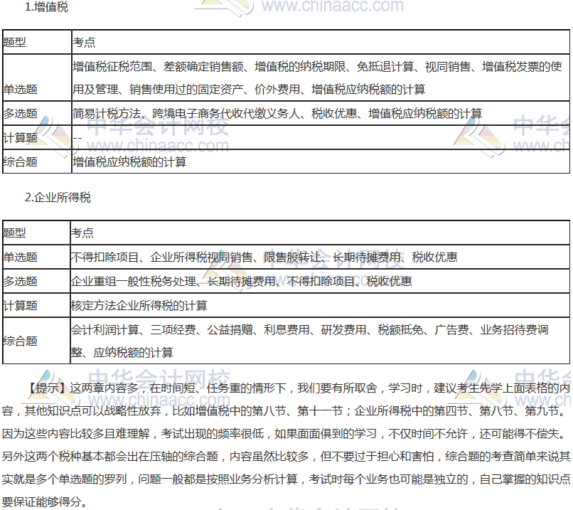 降龙十八掌虽然招式多,但是威力极大,在考试中这就跟咱们的增值税和企业所得税一样,虽然这两个税种在教材的内容很多,但是考查的内容比较直接,分值占据考试“半壁江山”,若把这两个税种学好,便可以“独领风骚”,成为武林中的佼佼者。但教材那么多内容,我们该如何下手呢?下面表格的内容是近几年考查过的知识点,建议先从这些知识点中下手。