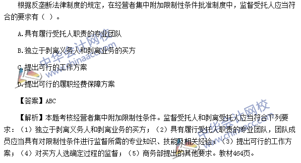 【点评】本题主要考核“反垄断法律制度”的“经营者集中附加限制性条件”知识点。该知识点与网校2015年注会经济法特色班模拟试题2第21题、2015注会经济法全真模拟试卷91页24题考点基本相同。另外在2015年“梦想成真”系列辅导丛书之《应试指南.注会经济法》363页第19题、《经典题解.注会经济法》328页第12题中均有体现。另外,在网校苏苏老师串讲班中提及。