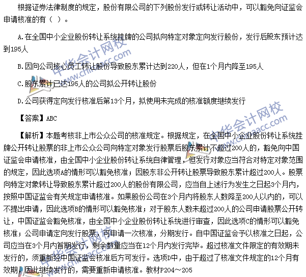 【点评】本题主要考核“证券法律制度”的“非上市公众公司的核准”知识点。该知识点与网校2015年考试中心开通的特色班模拟试题(一)单选第16题考点基本相同。另外在2015年“梦想成真”系列辅导丛书之《经典题解•注会经济法》208页第2题中均有所体现。另外,在网校苏苏老师串讲班中提及。