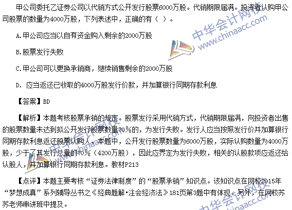 【点评】本题主要考核“证券法律制度”的“股票承销”知识点。该知识点在网校2015年“梦想成真”系列辅导丛书之《经典题解•注会经济法》181页第3题中有体现。另外,在网校苏苏老师串讲班中提及。
