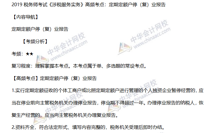 距离2019年税务师的考试仅剩一个多月的时间了,大家都复习的怎么样了呀?在最后冲刺备考的时间里,大家千万不要盲目的复习,正保会计网校为大家精心准备了《涉税服务实务》的高频考点,小编会定期更新,大家记得关注哦~