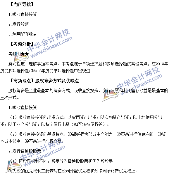 我们一起来学习2015税务师考试《财务与会计》高频考点:股权筹资方式及优缺点。本考点属于《财务与会计》第四章筹资与分配管理的内容。
