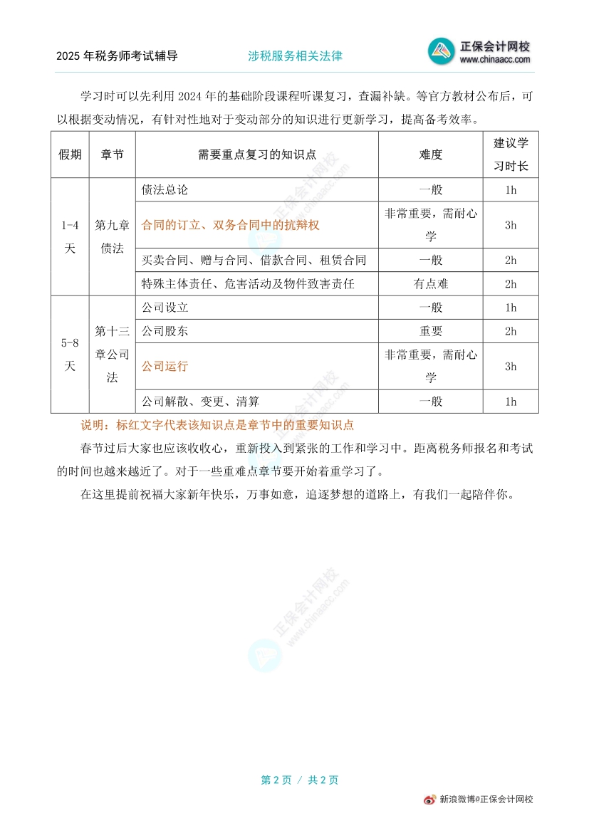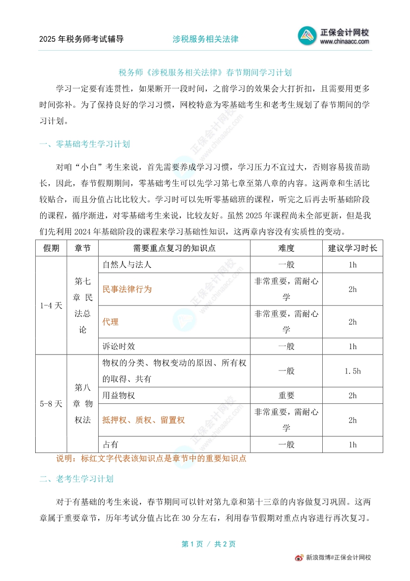 春节假期期间,大家可以利用这段时间学习,丰富自己的精神知识,每天坚持学习,有时并不是为了增加多少知识,而是为了减缓我们遗忘的速度。网校老师给大家准备了2025税务师《法律》春节学习计划,让我们一起学起来。
