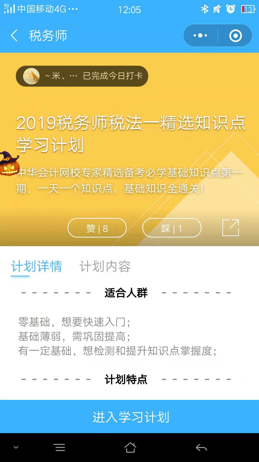 进入税务师考试专属频道后,选择科目后,点击下方“进入学习计划”按钮,即可进入学习