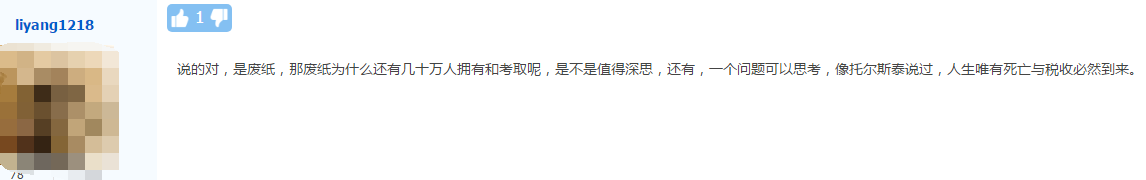 就这样,大家你一言我一语地讨论着,观点确是出奇地一致,那就是税务师证书并不是一张废纸,是特别有含金量,特别有前途的一个证书。