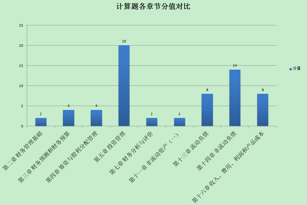推论:从柱形图中可以看出,计算题常考的章节是第五章、十四章、十六章。其次是第三章、第四章、第十三章。第十三章是在2016年考查过,其他年份没有涉及。所以如果大家想拿高分,在备考时就应多练习计算题,因为计算题总体难度不大,主要考查计算能力。其中一道计算题必定考查的是财务部分的知识,主要是集中在第三章、第四章、第五章。会计部分集中在第十四章、十六章。有时也会考查第二十章的知识点。