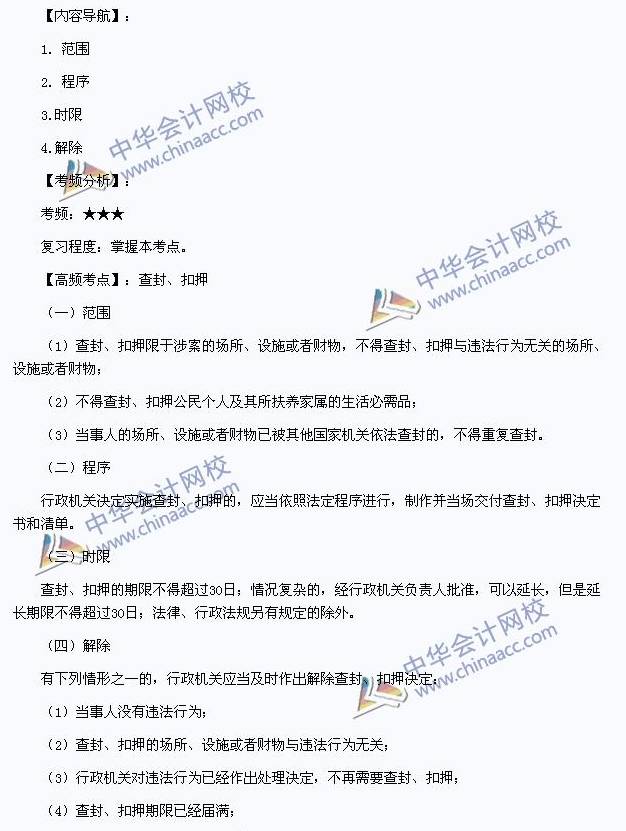 我们一起来学习2014年《税收相关法律》高频考点:查封、扣押。本考点属于《税收相关法律》第一篇第四章行政强制法律制度第二节行政强制措施的实施的内容。