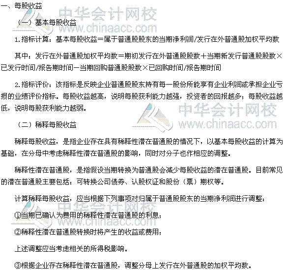 复习程度:理解掌握本考点。本考点属于单项选择题、多项选择题和计算题的常设考点,重点掌握每股收益的计算,其在2015年度、2012年度和2010年度出现过单项选择题,2015年度、2012年度出现过多项选择题,2013年度出现过计算题。