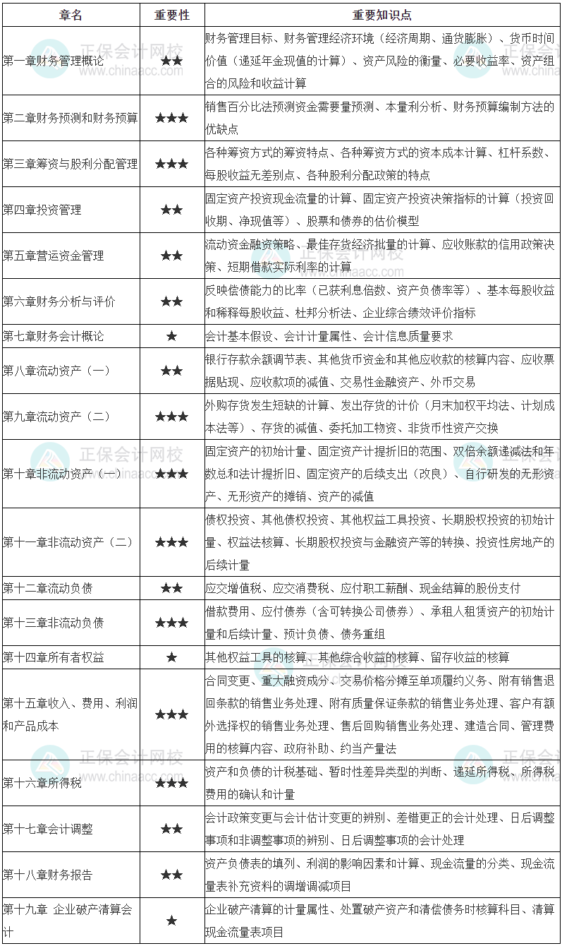 | 第二层级 | 第一章 财务管理概论、第二章 财务预测和财务预算、第三章 筹资与股利分配管理、第四章 投资管理、第五章 营运资金管理、第六章 财务分析与评价、第八章 流动资产(一)、第十二章 流动负债、第十七章 会计调整 |