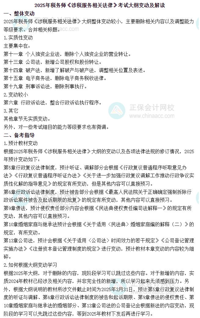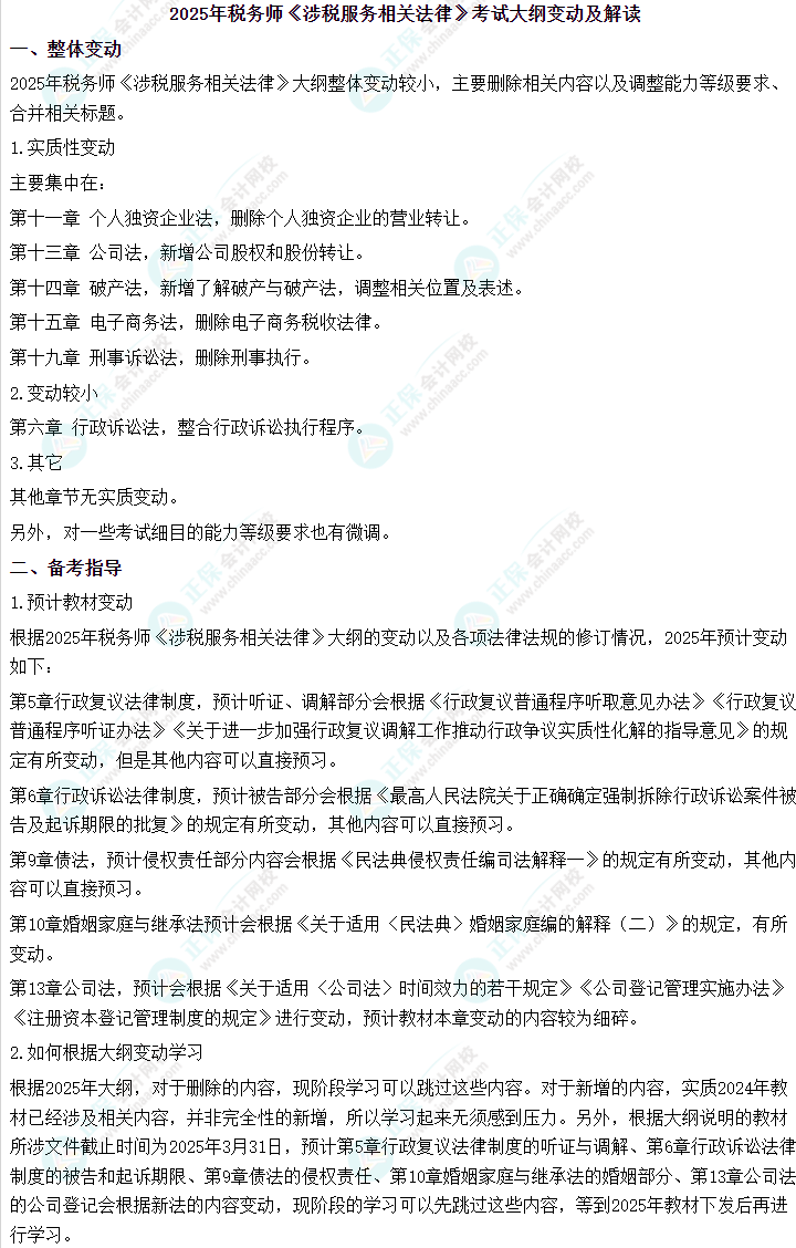 2025年税务师考生翘首期盼的考试大纲出来了,快随正小保一起了解下今年的税务师考试大纲变化点在哪里。下面是2025税务师《涉税服务相关法律》考试大纲变化解读的内容,认真看看哦!