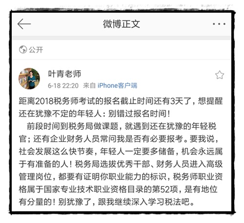 所以,如果你还想在会计行业继续深入发展,或是职业发展迷茫不知前路如何,只要符合税务师考试报名条件,为何不来参加尝试一下呢?2018年税务师考试补报名入口7月25日开通,现在就可以开始学习,就像叶青老师所说的那样,机会永远属于有准备的人!