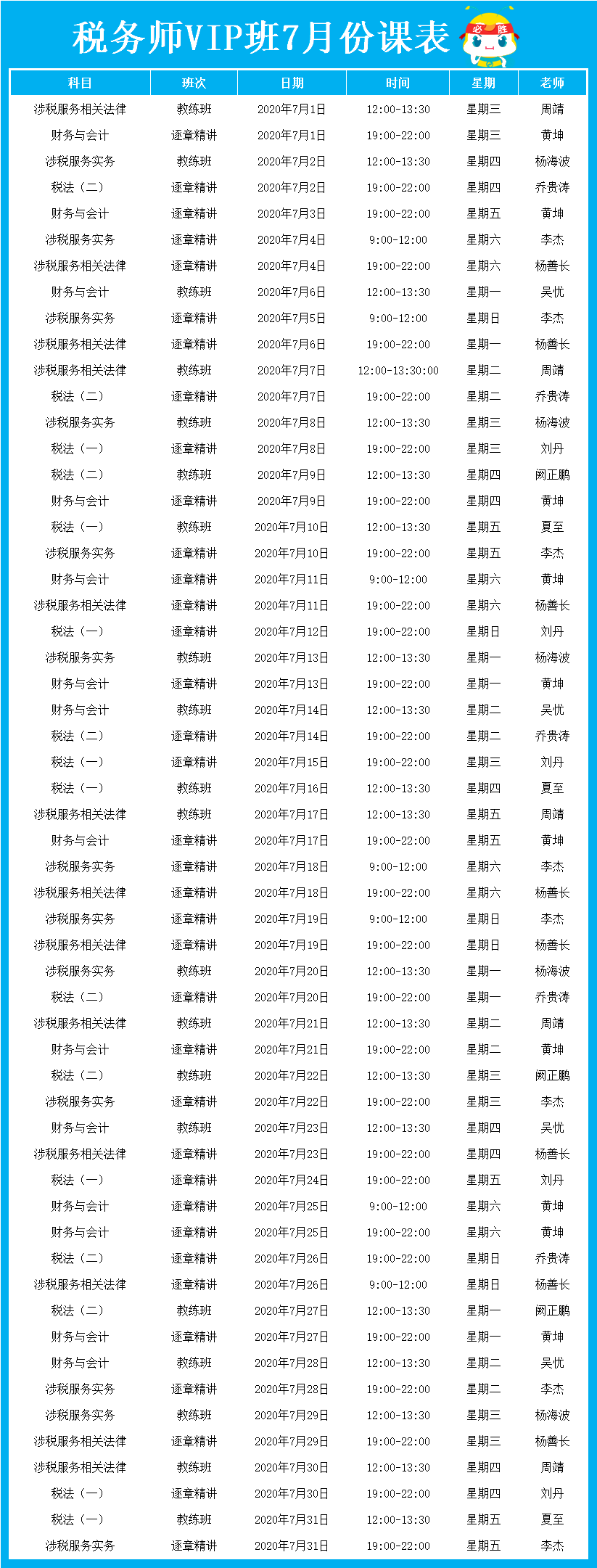 2020年税务师VIP签约特训班7月份课表新鲜出炉,快来抱走!网校VIP直播课可以回放,所以错过直播时间或者需要反复看课的同学可以看“直播回看”。