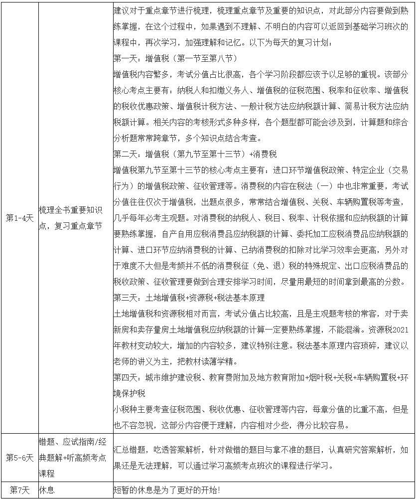 十一假期到,距离税务师考试还有1个多月的时间,税务师考试的复习进入了冲刺阶段,平时的备考可能很难有集中的时间来复习,所以我们要充分利用十一黄金周来查漏补缺,短短六七天的时间可能不能整体系统地学习或者复习一遍,但是可以把整个课程各个章节中的重点、难点复习一遍,加深理解!那么接下来就按照网校为您提供的学习计划,度过一个充实而愉快的假期,为拿下税务师税法一再加一把劲吧!
