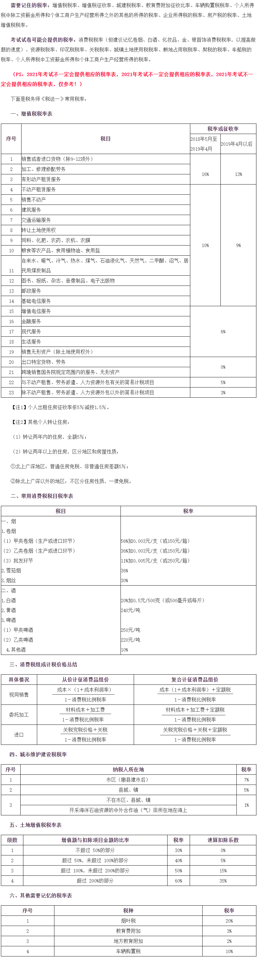 税务师考试方式是以机考的形式考试。其中《税法一》、《税法二》、《涉税服务实务》考试系统会自带“附表”,也就是考试时会提供一部分税率。网校根据近两年的考试情况总结了税务师考生需要记住的税率,和考试时可能会提供的税率,供大家参考: