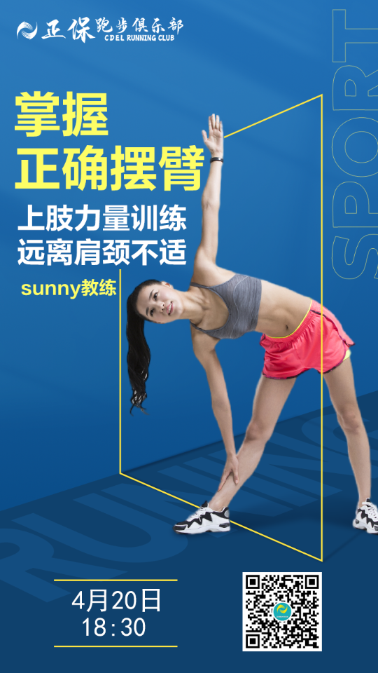 正保跑步俱乐部4月20日18:30,Sunny教练直播教你如何掌握正确摆臂姿势~