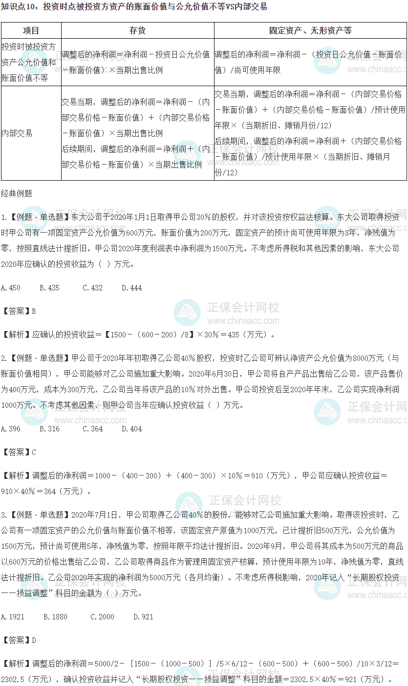 又一计算考点,比对一下被投资方资产的账面价值与公允价值不等时,存货与固定资产、无形资产等的计算;还有内部交易时,存货与固定资产、无形资产等的计算。很容易搞混,也容易出错,所以必须掌握。