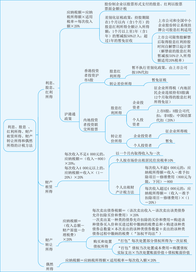下面是2023年税务师《税法二》第二章思维导图:利息、 股息、 红利所得、 财产租赁所得、财产转让所得和偶然所得的计税方法