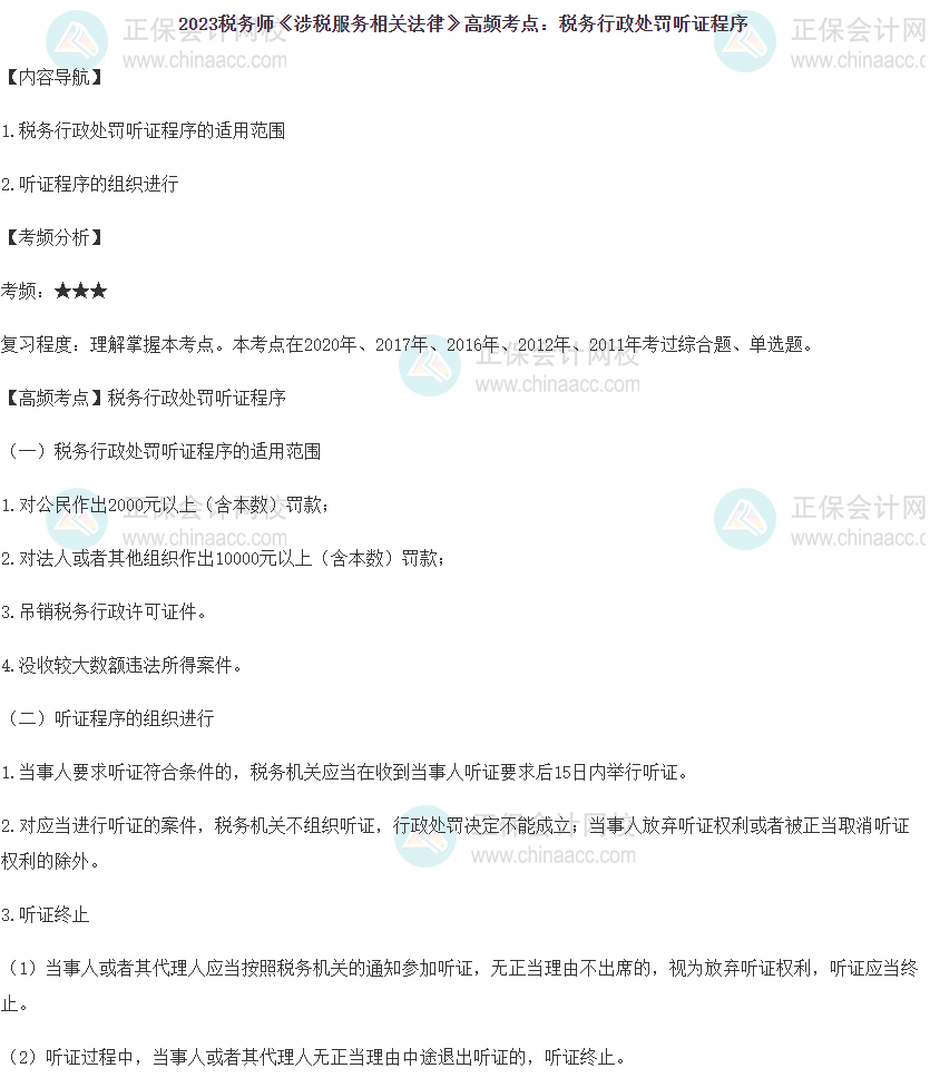 2023税务师《涉税服务相关法律》第三章,去年三轮考试虽分值不大,但均有考核。考核到的知识点有:行政处罚实施主体、税务行政处罚的原则、税务行政处罚程序、行政处罚听证程序、重大税务案件审理委员会、善意取得增值税专用发票。