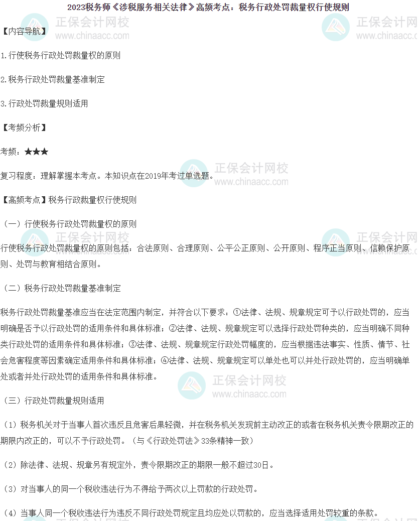 2023税务师《涉税服务相关法律》第三章,去年三轮考试虽分值不大,但均有考核。考核到的知识点有:行政处罚实施主体、税务行政处罚的原则、税务行政处罚程序、行政处罚听证程序、重大税务案件审理委员会、善意取得增值税专用发票。