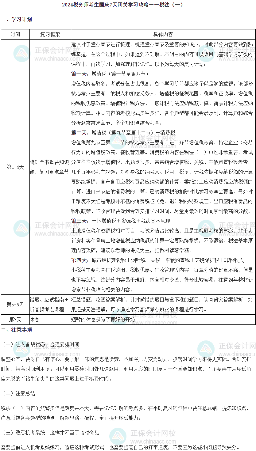 到了十一,距离税务师考试还有1个月的时间,税务师考试的复习进入了冲刺的阶段,平时的备考中很难有集中的时间来复习,所以我们要充分利用十一黄金周,沉下心来,夯实基础,发现漏洞,完善漏洞,更上一层楼!按照网校提供的学习计划,度过一个充实而愉快的假期,为拿下税务师税法(一)再加一把力!