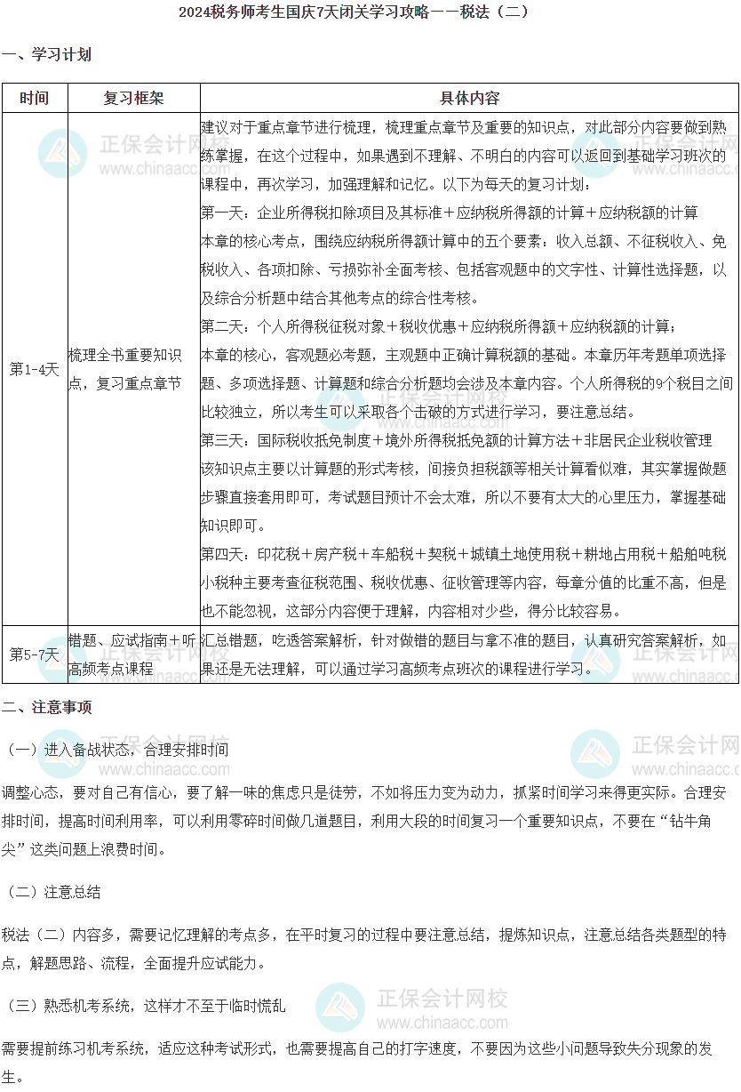 到了十一,距离税务师考试还有1个月的时间,税务师考试的复习进入了冲刺的阶段,平时的备考中很难有集中的时间来复习,所以我们要充分利用十一黄金周,沉下心来,夯实基础,发现漏洞,完善漏洞,更上一层楼!按照网校提供的学习计划,度过一个充实而愉快的假期,为拿下税务师税法(二)再加一把力!
