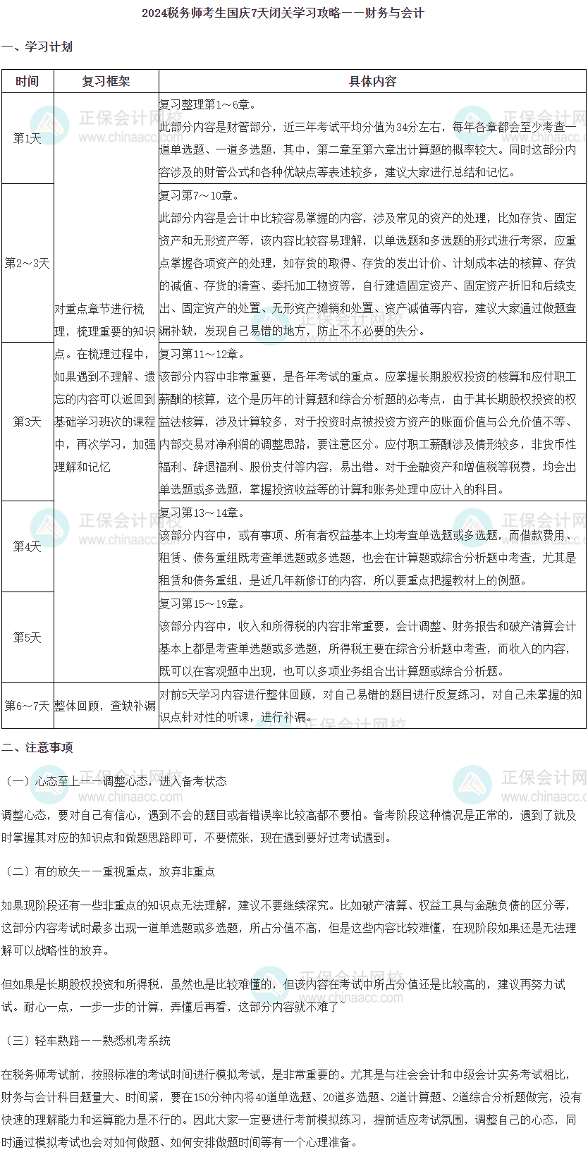 2024年国庆假期给大家提供了一个相对比较充足的时间进行备考复习,这是一个提升实力的好机会。下面是正保会计网校为税务师考生准备的《财务与会计》十一假期学习计划,速来查收,一起“加油”吧!