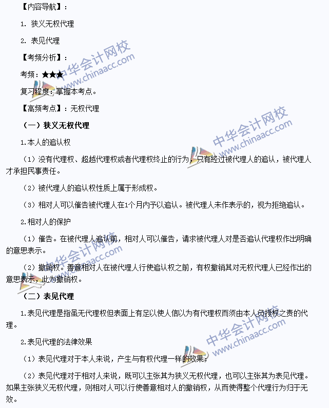 我们一起来学习2014年《税收相关法律》高频考点:无权代理。本考点属于《税收相关法律》第二篇第一章民法基本理论概述第六节民事法律行为的内容。