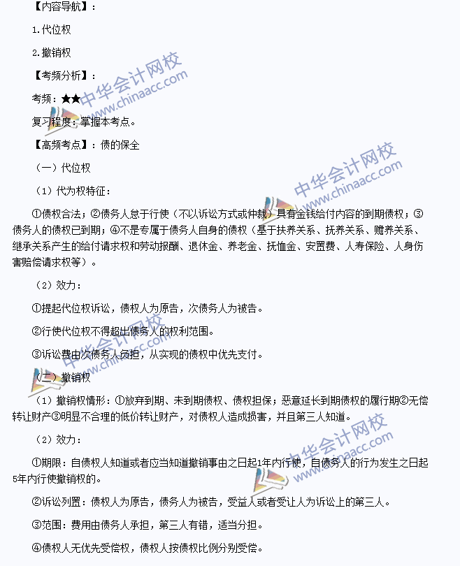 我们一起来学习2014年《税收相关法律》高频考点:债的保全。本考点属于《税收相关法律》第二篇第三章债权法律制度第一节债概述的内容。