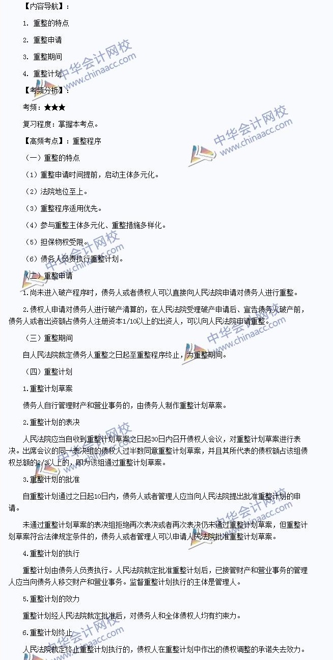 我们一起来学习2014年《税收相关法律》高频考点:重整程序。本考点属于《税收相关法律》第二篇第六章破产法律制度第五节重整程序与和解程序的内容。