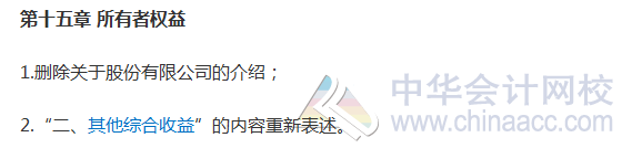 《财务与会计》教材第十五章关于所有者权益的知识点有一些变动,比如删除了关于股份公司的介绍,教材内容变化,涉及到我们考生遇到的考试命题的变化,所以一定要好好看看。