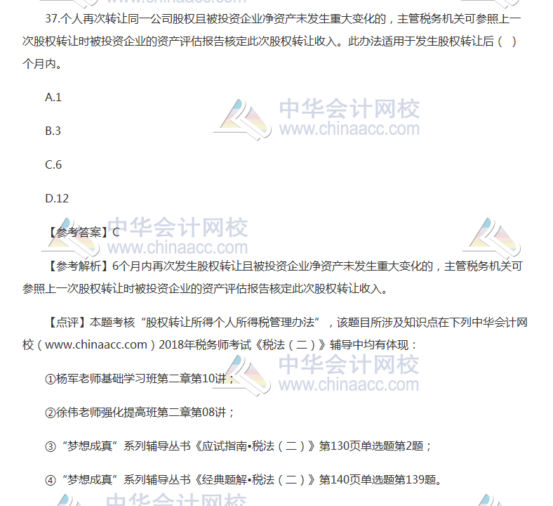 39.个人再次转让同一公司股权且被投资企业净资产未发生重大变化的,主管税务机关可参照上一次股权转让时被投资企业的资产评估报告核定此次股权转让收入。此办法适用于发生股权转让后( )个月内。