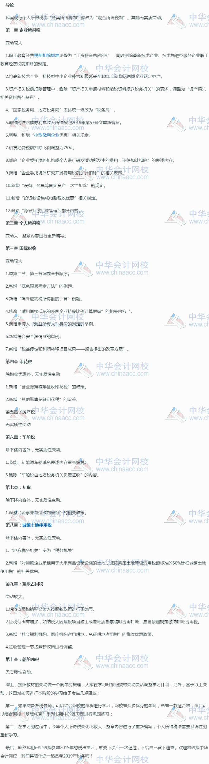 2019年注册税务师考试教材变化大吗?税法二教材有哪些变化呢?税务师税法二教材变动达35%!变化的内容还是挺多的,不管是企业所得税、个人所得税等大税种,还是印花税、契税、船舶吨税等小税种,每个知识点都不要错过,教材变动的地方往往需要特别留意。了解税务师《税法二》教材变动内容,我们才能有目标有重点的学习。